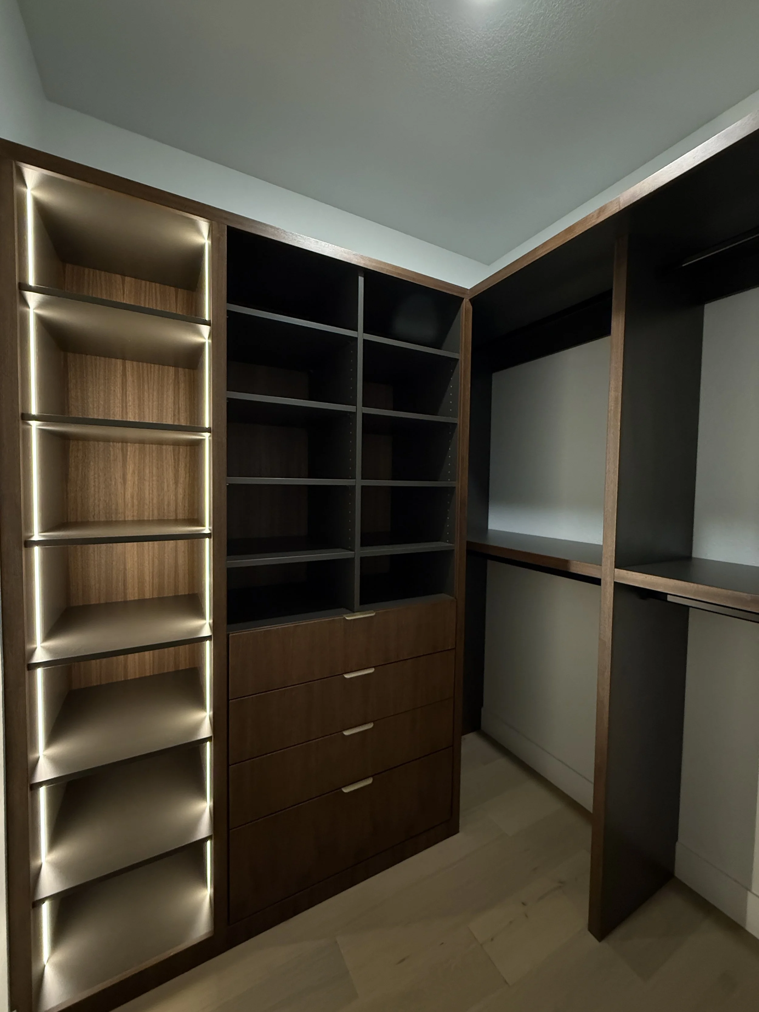 Custom walk-in and reach-in closets designed for organization and functionality.